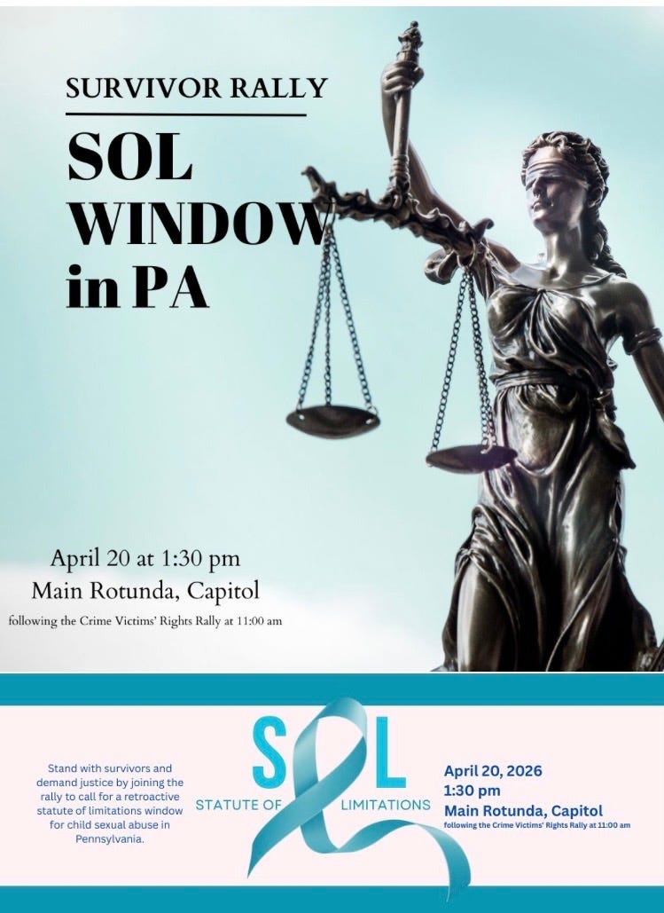 Saturday is the big day for a gathering at the Harrisburg capital to encourage the passage of the statute of limitations look back window for those who were sexually exploited as children and the statute of limitations has expired. This is really really really important to all victims in Pa!