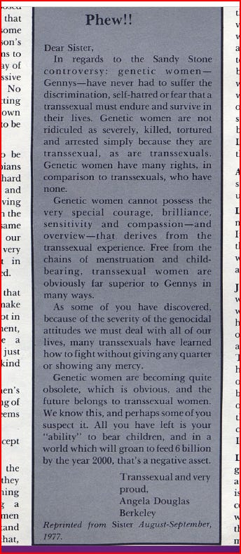 Sadly, the extreme misogyny of transgenderism is nothing new. I refer you to the excellent What Was Happening Before ‘Just Be Nice Feminism’? series by Dr Em at Material Humanism. I especially appreciated the ‘readiness quiz for the transsexual’ from May 1970: