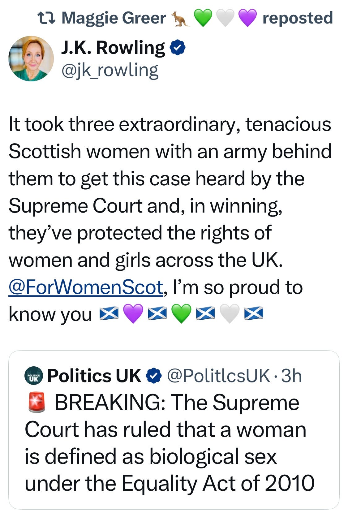 However, congratulations to For Women Scotland for their tireless work on behalf of women and girls! Woo hoo!! Common sense prevails!! What a concept!!