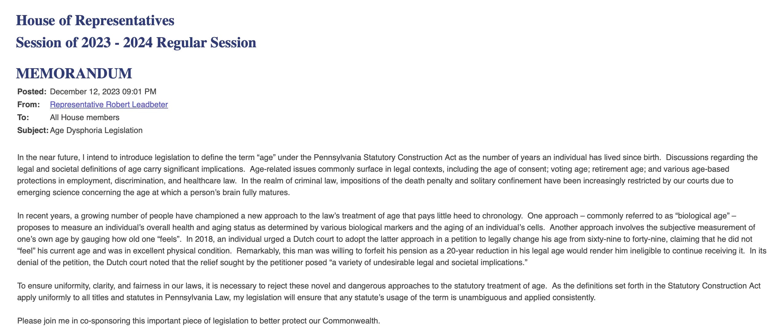 So, we applaud State Representative Leadbeter for this memorandum. Read it in all its glory and share it with people who push back at you with “trans rights” gobbledegook. If someone responds that age and gender are different, just show them the evidence that many people at the heart of the trans movement think age is a social construction as well.