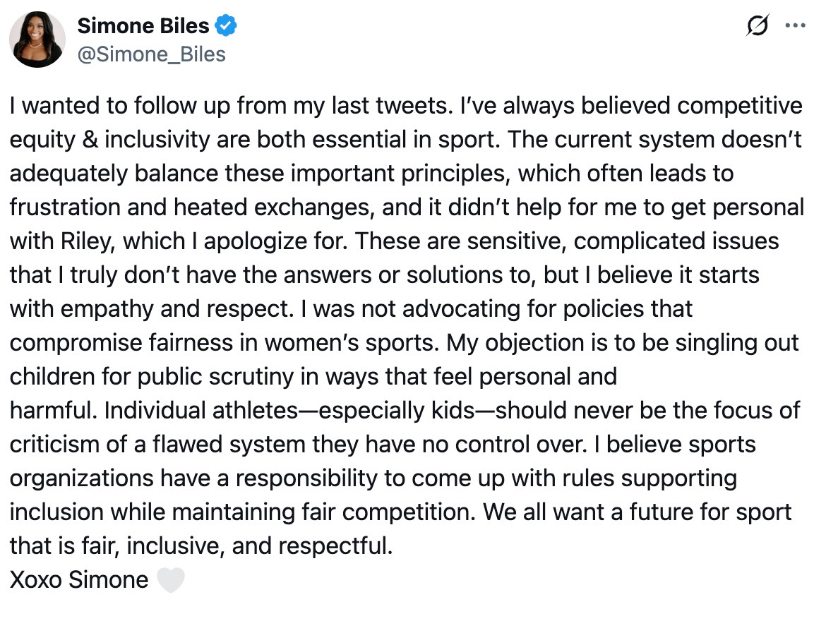 Second, Simone Biles apologized to Riley Gaines via Xitter. First, Jennifer Sey’s initial response to Biles is here. I quote verbatim from Sey at XX-XY Athletics in her email dated June 12, 2025: