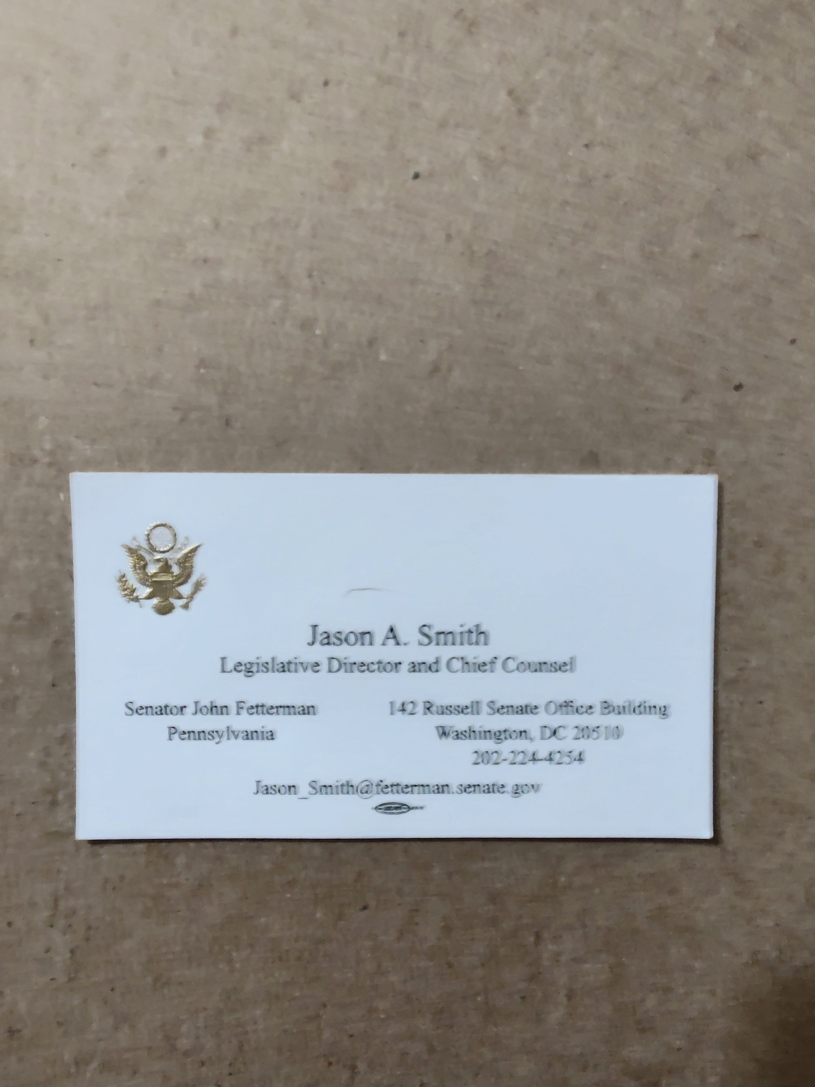 As we seated ourselves around the conference table, Mr Jason A Smith, Legislative Director and Chief Counsel for Senator Fetterman (LinkedIn; note the pronouns in his bio. Plus no photo. Plus he attended Evergreen State. That explains a lot), distributed his business card to everyone.